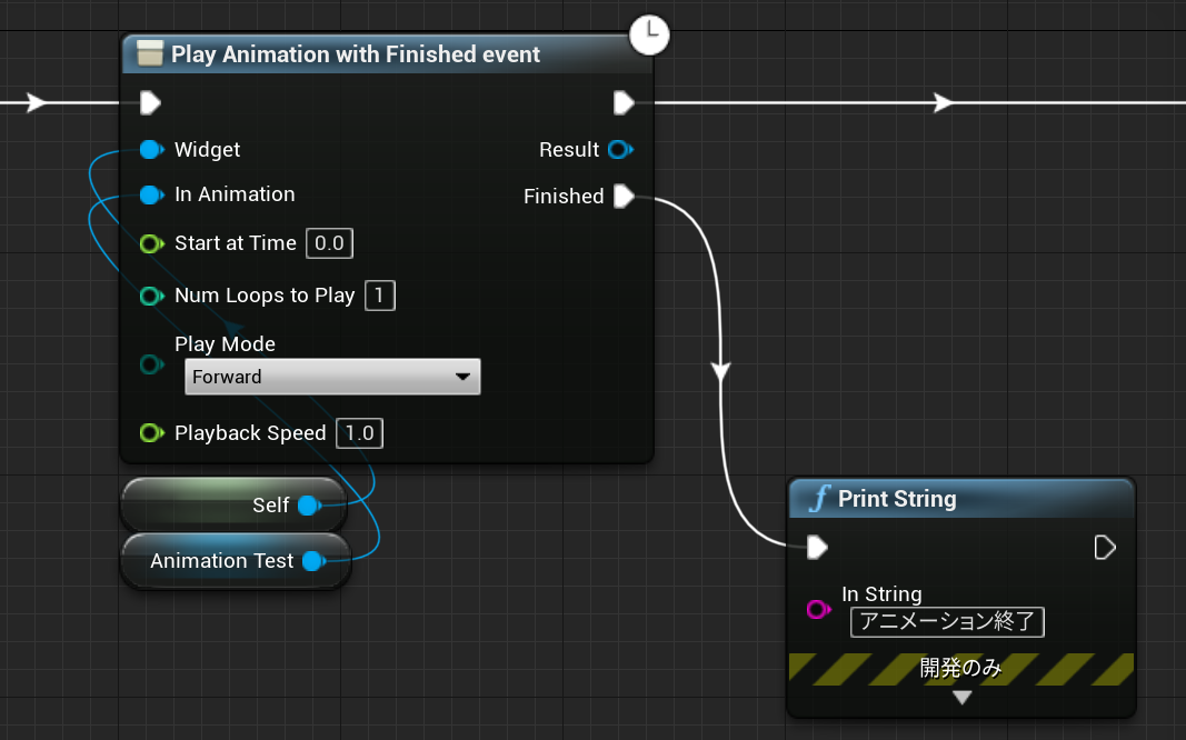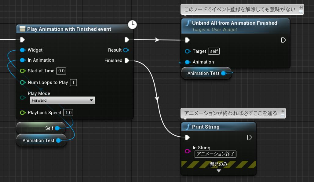 ついでに、PlayAnimationWithFinishedEventノードを使うとFinished実行ピンにつないだ処理を後から無効にできないということは頭に入れておきたい。