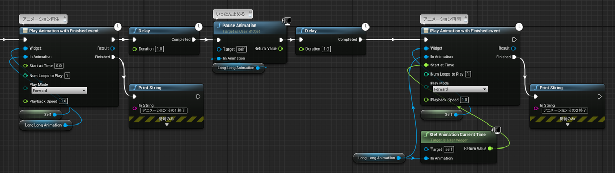 PlayAnimationWithFinishedEventノードを使ってアニメーション再生 -> 一時停止 -> 再開 -> アニメーション終了というもの。