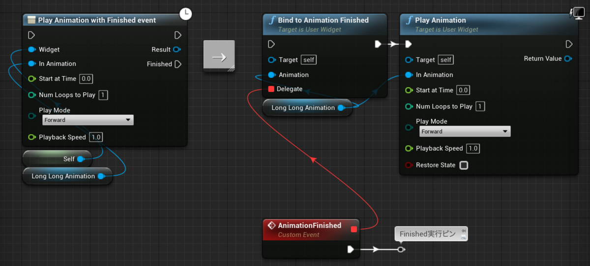 なんでやろ?て思ったけど、PlayAnimationWithFinishedEventノードの中身を検証してみるとこの動作に納得できた。